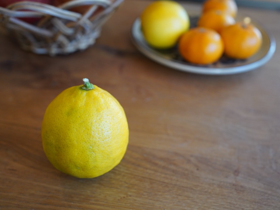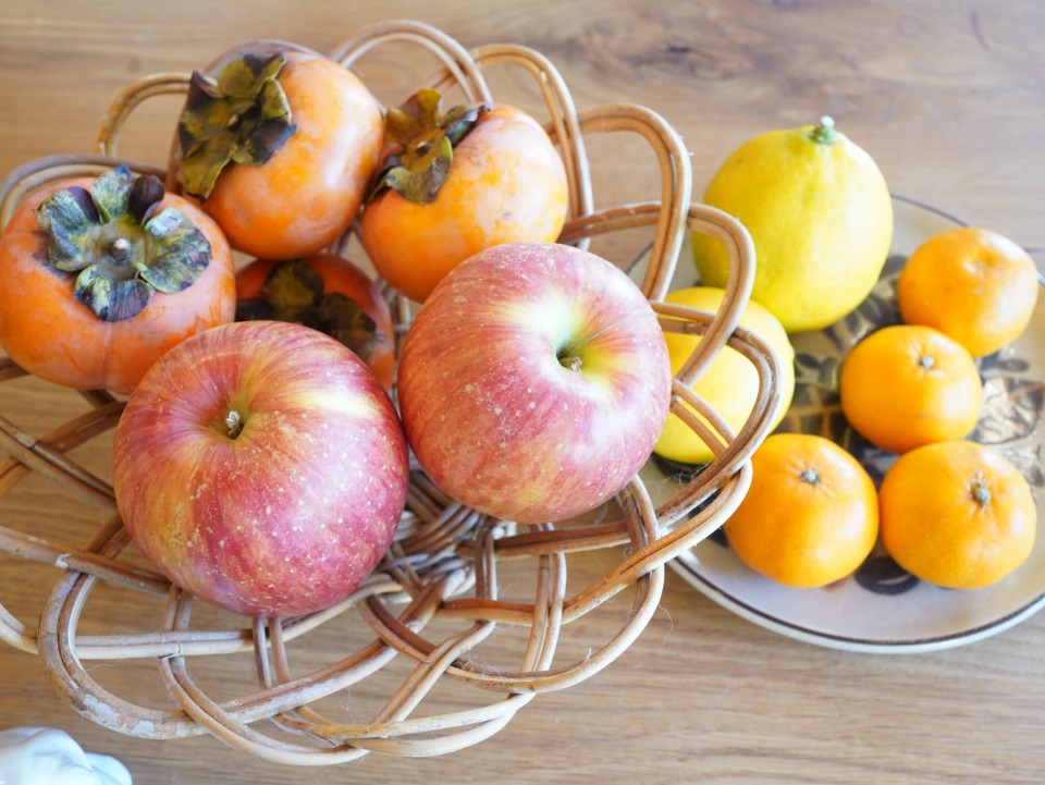 お客様からいただいた、りんご、みかん。ご近所さんからもぎたての柿。そしてレモンですっ