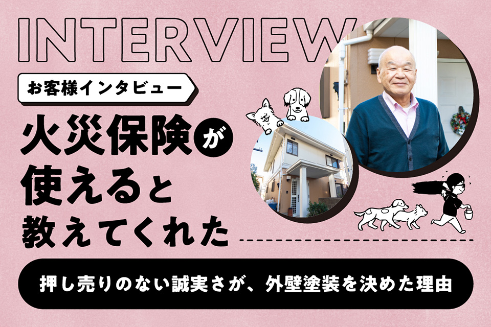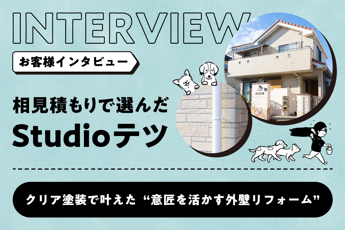 施工事例 Works ホーム施工事例 お客様インタビューその他外壁塗装屋根塗装 すべての事例 Read more 2026.01.22 お客様インタビュー 【お客様インタビュー/千葉県】 相見積もりで選んだStudioテツ——クリア塗装で叶えた“意匠を活かす外壁リフォーム” Read more 2026.01.20 お客様インタビュー 【お客様インタビュー/千葉県】 「火災保険が使えると教えてくれた」——押し売りのない誠実さが、外壁塗装を決めた理由 Read more 2025.12.09 お客様インタビュー 【お客様インタビュー/千葉県】 「初めての外壁塗装でも、不安が安心に変わる」——台風被害を機にStudioテツへ Read more 2025.11.28 お客様インタビュー 【お客様インタビュー/千葉県】 「下地に自信。人柄に納得」——3回目の外壁塗装でStudioテツを選んだ理由 Read more 2024.01.16 外壁塗装屋根塗装 【施工事例13/千葉県】 楽しい!が詰まった塗り替え Read more 2022.01.15 外壁塗装屋根塗装 【施工事例12/酒々井町】 千葉県酒々井町で外壁屋根塗装グリーン系 Read more 2021.10.02 外壁塗装屋根塗装 【施工事例11/四街道市】 千葉県 四街道市 外壁塗装・屋根塗装・玄関ドア塗装 Read more 2021.09.21 その他 【施工事例10/千葉市】 屋根塗装 乾式コンクリート瓦塗装 Read more 2021.08.17 外壁塗装 【施工事例09/酒々町】 外壁塗装(タイル調仕上げ) 一覧に戻る次へ