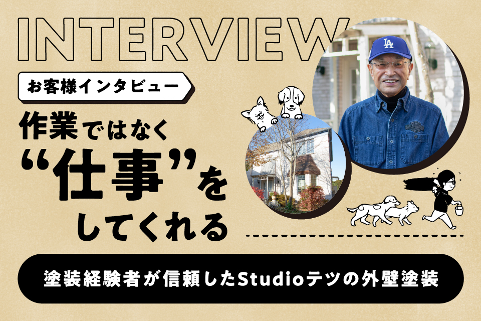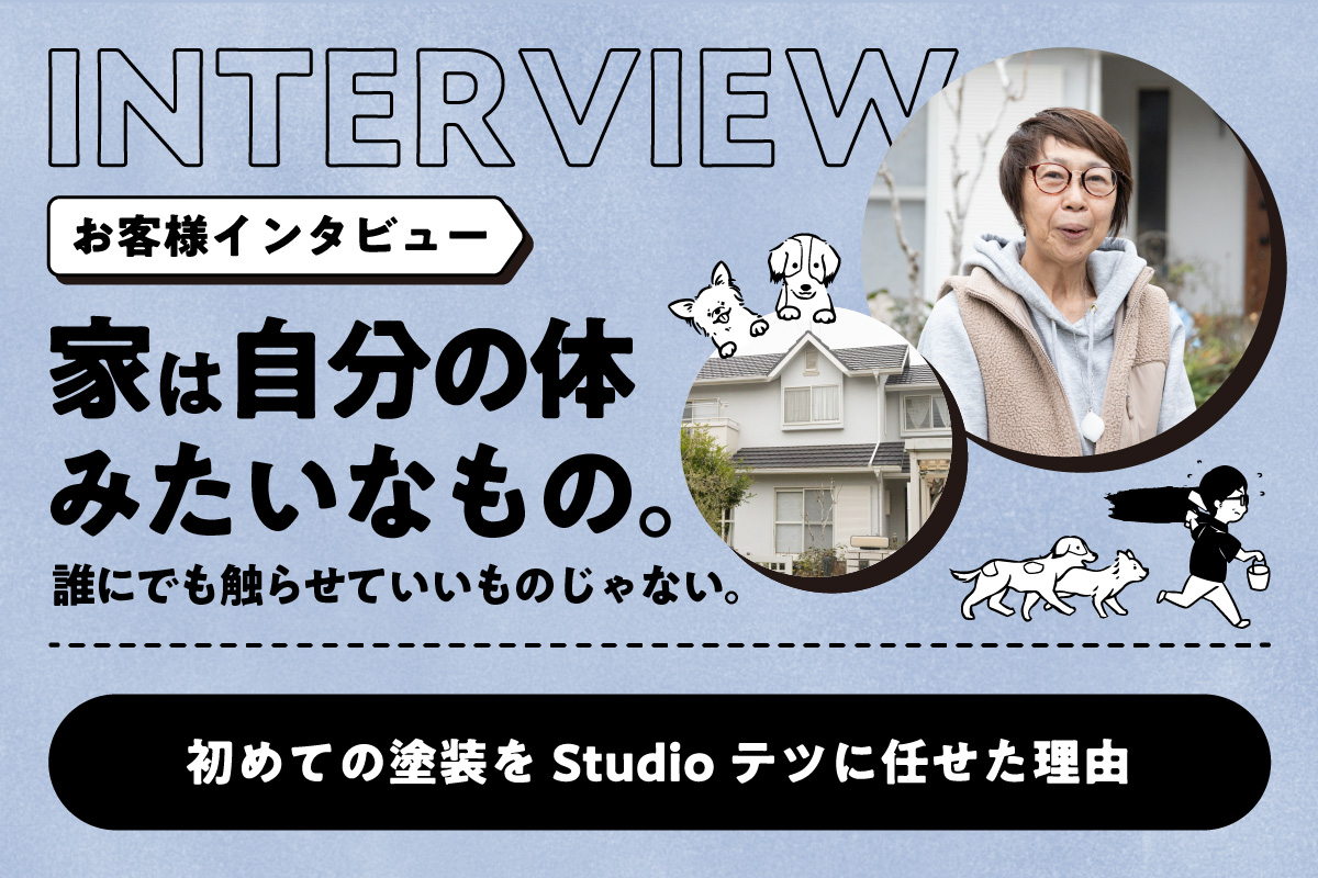 施工事例 Works ホーム施工事例 お客様インタビューその他外壁塗装屋根塗装 すべての事例 Read more 2026.03.13 お客様インタビュー 【お客様インタビュー/千葉県】 「家は自分の体みたいなもの。誰にでも触らせていいものじゃない」——初めての塗装をStudioテツに任せた理由 Read more 2026.03.12 お客様インタビュー 【お客様インタビュー/千葉県】 「作業ではなく“仕事”をしてくれる」——塗装経験者が信頼したStudioテツの外壁塗装 Read more 2026.01.22 お客様インタビュー 【お客様インタビュー/千葉県】 相見積もりで選んだStudioテツ——クリア塗装で叶えた“意匠を活かす外壁リフォーム” Read more 2026.01.20 お客様インタビュー 【お客様インタビュー/千葉県】 「火災保険が使えると教えてくれた」——押し売りのない誠実さが、外壁塗装を決めた理由 Read more 2025.12.09 お客様インタビュー 【お客様インタビュー/千葉県】 「初めての外壁塗装でも、不安が安心に変わる」——台風被害を機にStudioテツへ Read more 2025.11.28 お客様インタビュー 【お客様インタビュー/千葉県】 「下地に自信。人柄に納得」——3回目の外壁塗装でStudioテツを選んだ理由 Read more 2024.01.16 外壁塗装屋根塗装 【施工事例13/千葉県】 楽しい!が詰まった塗り替え Read more 2022.01.15 外壁塗装屋根塗装 【施工事例12/酒々井町】 千葉県酒々井町で外壁屋根塗装グリーン系 Read more 2021.10.02 外壁塗装屋根塗装 【施工事例11/四街道市】 千葉県 四街道市 外壁塗装・屋根塗装・玄関ドア塗装 一覧に戻る次へ